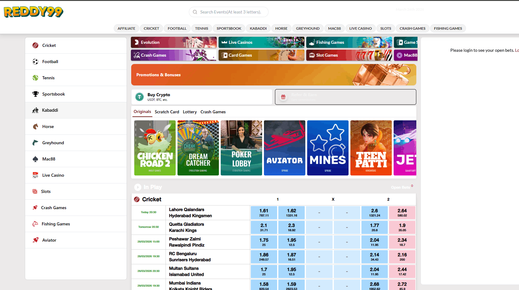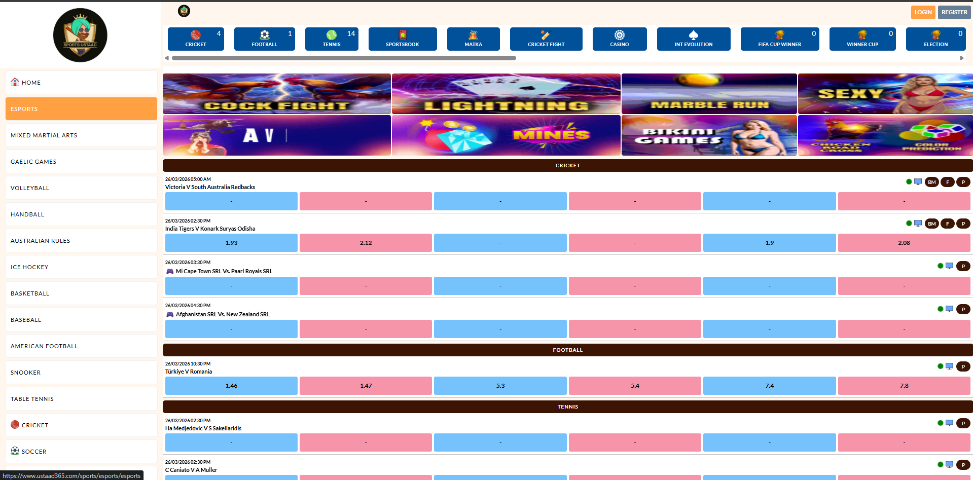 • Live betting markets for cricket and other sports
